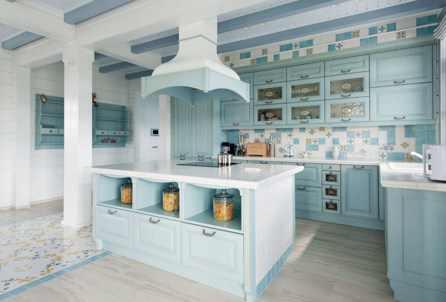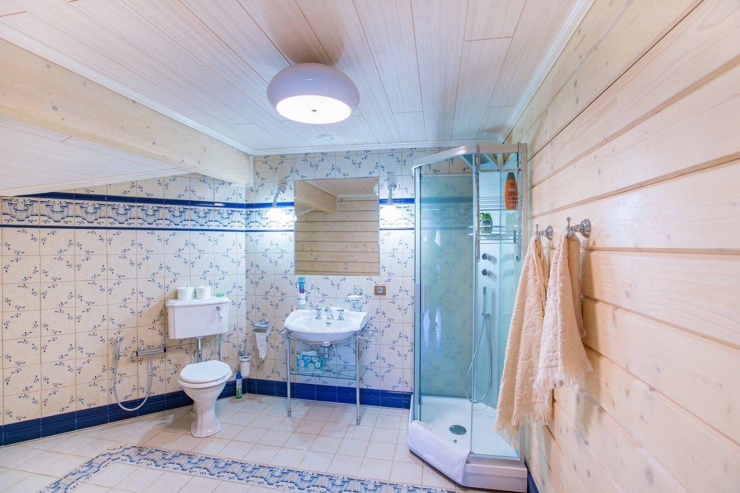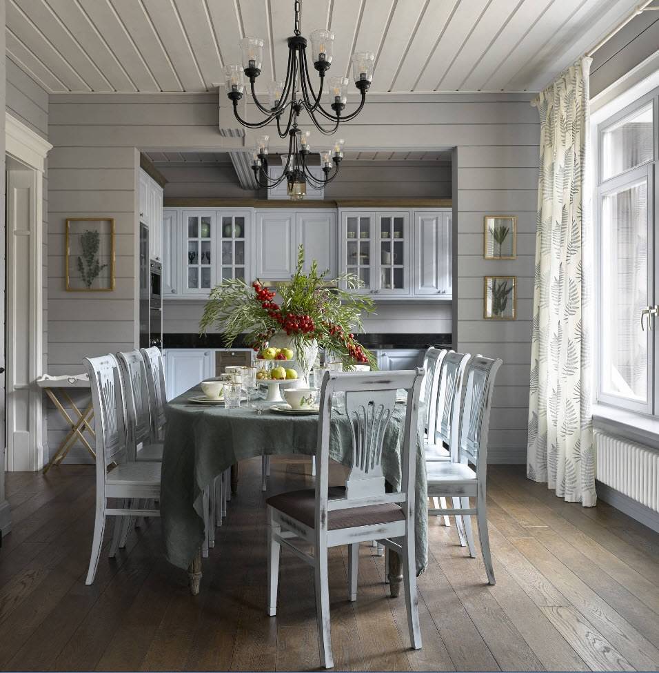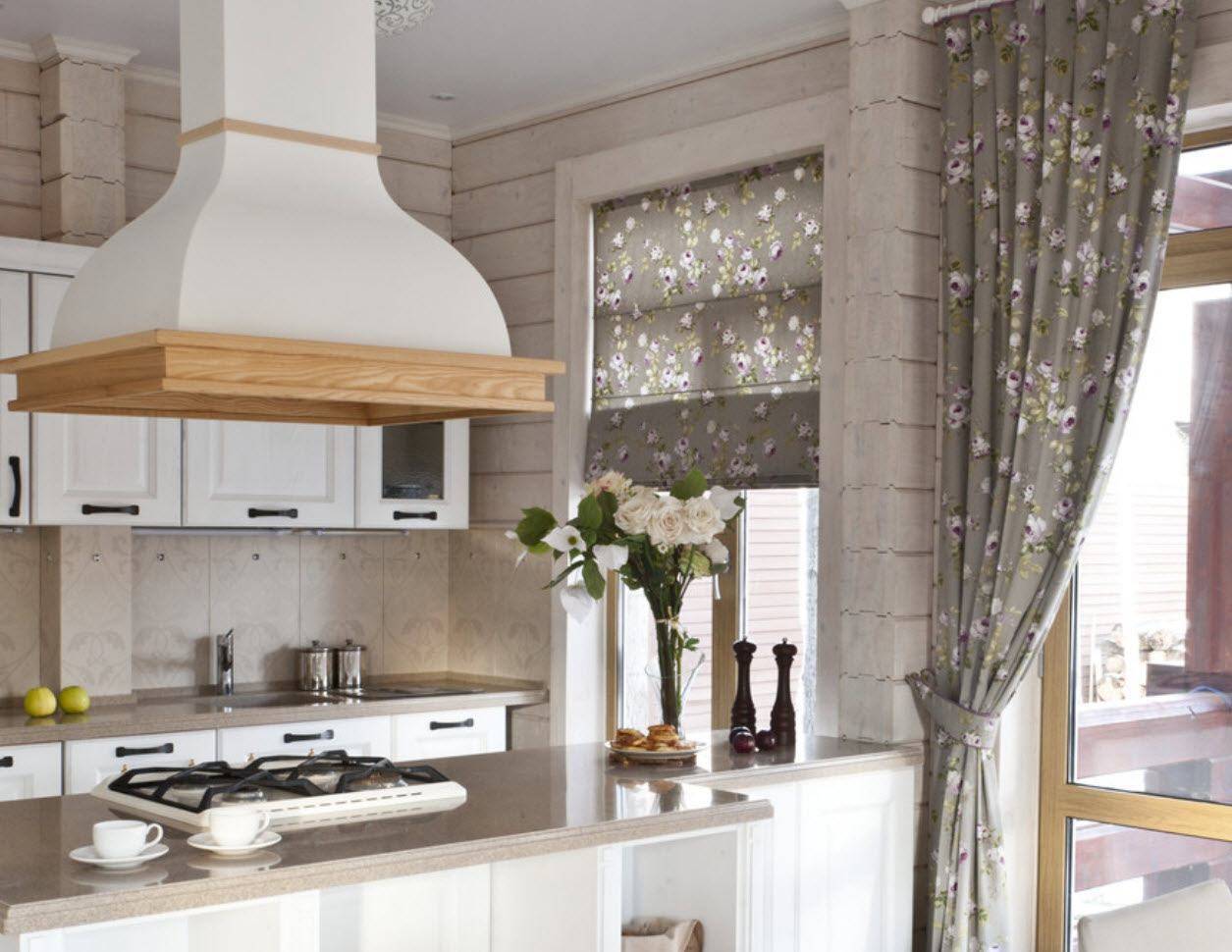 Деревянная обшивка с гораздо более широкими панелями по-прежнему используется. Особенно, когда вы намерены украсить кухню или ванную комнату в деревенском стиле. Здесь можно использовать как узкую, так и более широкую имитацию бруса, располагая по своему усмотрению. Полученная панель может быть окрашена в белый цвет или в пастельные тона, сочетаясь с нежным цветочным мотивом домашнего текстиля. Такие интерьеры требуют специальной мебели, предпочтительно деревянной, с декоративным оформлением