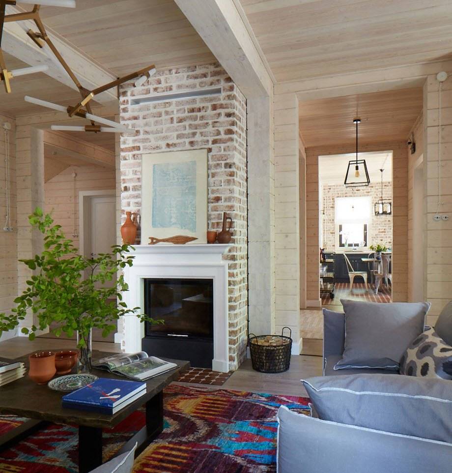 Удачным украшением и дополнением интерьера деревянного дома является камин. Живой красивый огонь оставляет восхитительные блики на натуральной деревянной поверхности, а в сочетании с присущим дереву ароматом получается настоящая симфония полумрака и таинственности.