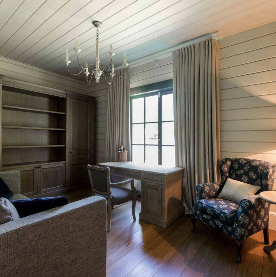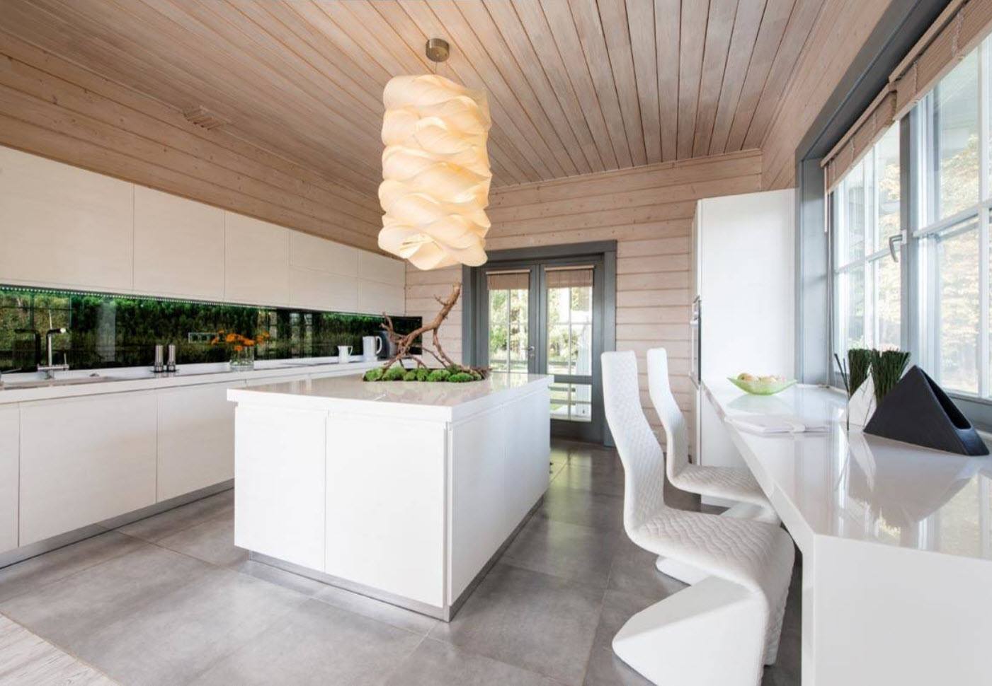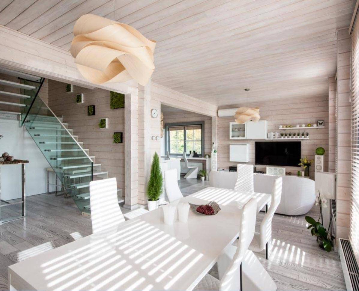Вторым по использованию для интерьера деревянного дома считается скандинавский стиль. Обстановка просто пронизана идеей минимализма, простоты и выдержанности. Белые, бежевые и голубые цвета в сочетании с солнечным светом из просторных окон создают прекрасную атмосферу дома.
