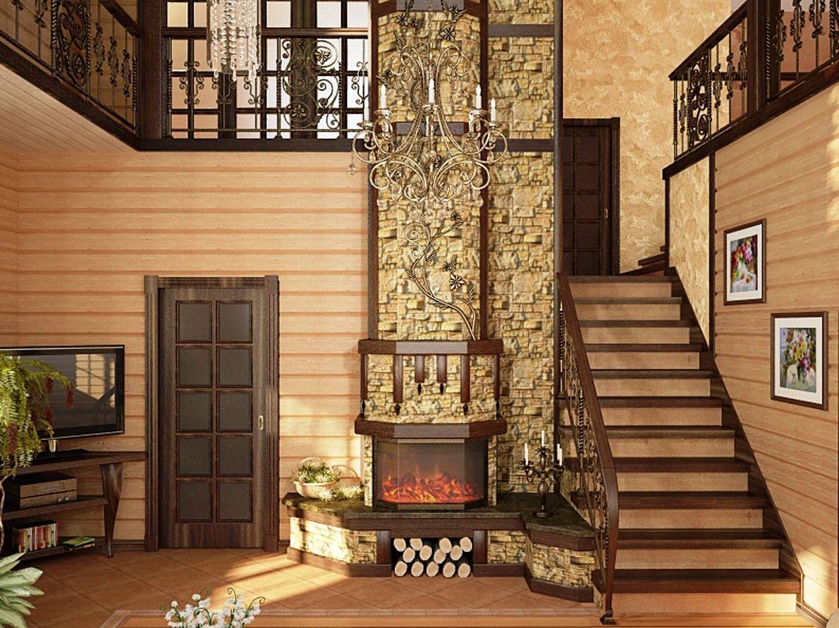 Располагается камин в центральном месте дома, считается основным элементом интерьера, обеспечивая пространство особым уютом, теплом. Под мягким освещением натурального огня наступает расслабление. Монтажные работы по установке камина, как и он сам, должны соответствовать ГОСТу. Для деревянного дома установка источника огня довольно рискованное дело, необходимо предупредить попадание искр на деревянные поверхности и предусмотреть строительство качественной тяги.