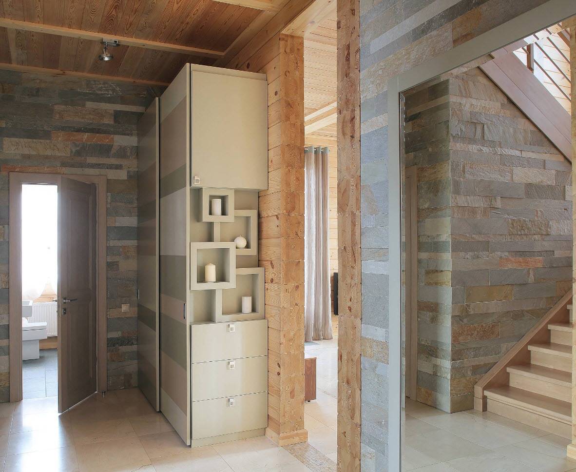 На фоне дерева презентабельно выглядят натуральные камни, которые только поддерживают направленность дома в сторону природы. Такая отделка эстетична и практична – срок службы каменных изделий исчисляется не одним десятком лет.