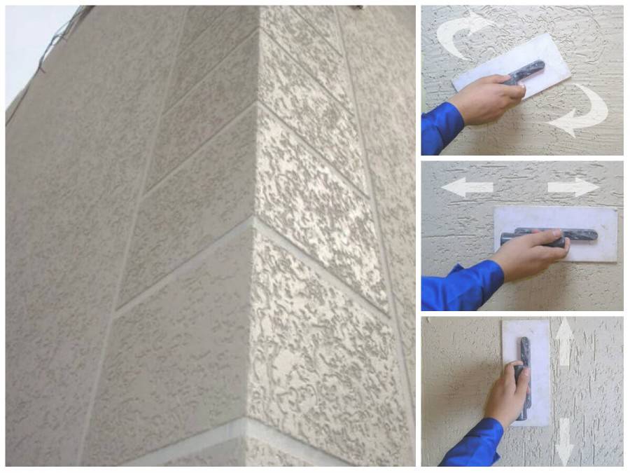 Выбранный вариант фактуры легко создается теркой или пластиковой кельмой. Любой из инструментов прижимается к материалу и немного вдавливается в него. Необходимый узор будет формироваться с помощью ловкости движений мастера по подготовленному материалу: