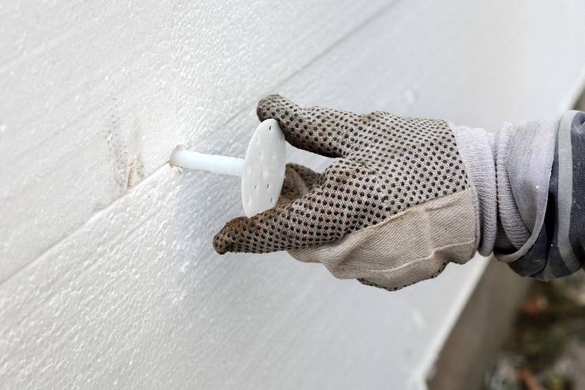 В завершение производится еще и механическая фиксация плит утеплителя, чтобы исключить риск их отслоения от поверхности. Из расчета 5-6 крепежных элементов на лист, крепят их при помощи тарельчатых дюбелей.