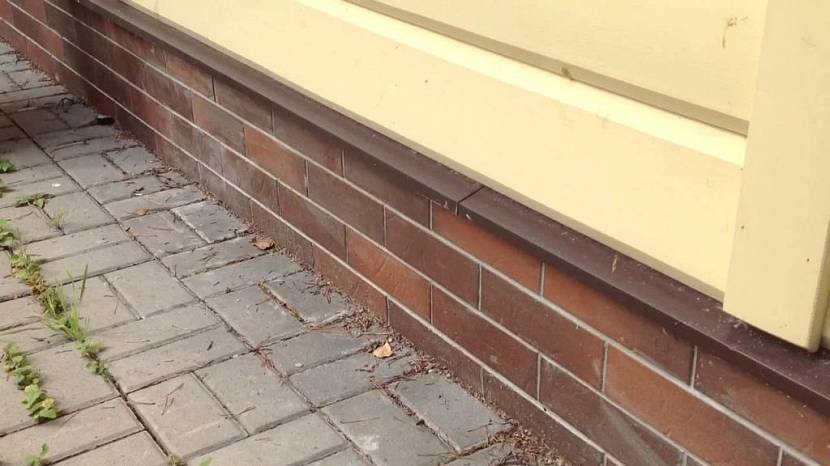 - Выступающий. Для того, чтобы выполнить обшивку подобного цоколя кирпичного дома собственноручно, вам потребуется (как и в во втором варианте) качественно продумать сливную систему. Если выполнить ее обустройство неправильно, то вода начнет скапливаться на участке разделения фундамента, а также на поверхности стен. Чтобы у вас не было подобных неприятностей, отведение влаги следует обязательно планировать с учетом отделки фасада.