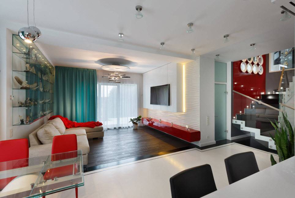 Зачастую дизайнеры рекомендуют использовать светлые тона, но не забывать о размерах комнаты. Если помещение большое, то использование черного и темно-серого цветов допускается, а вот в маленькой комнате лучше использовать светлые оттенки, позволяющие визуально увеличить пространство. Яркие и насыщенные цвета можно использовать только в виде выразительного акцента, например, окрашенная в яркий цвет стена или оригинальное кресло красного, желтого или оранжевого цвета.