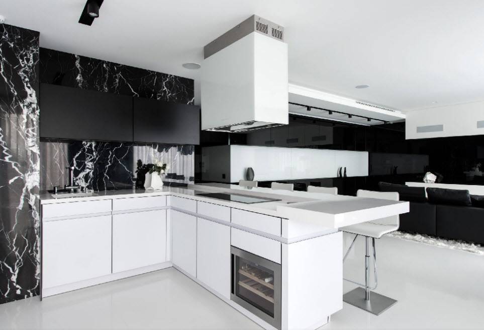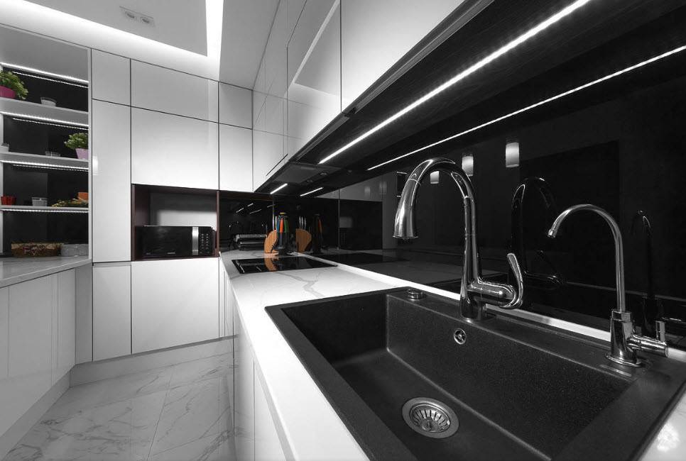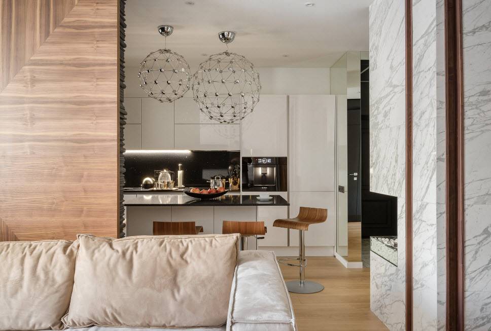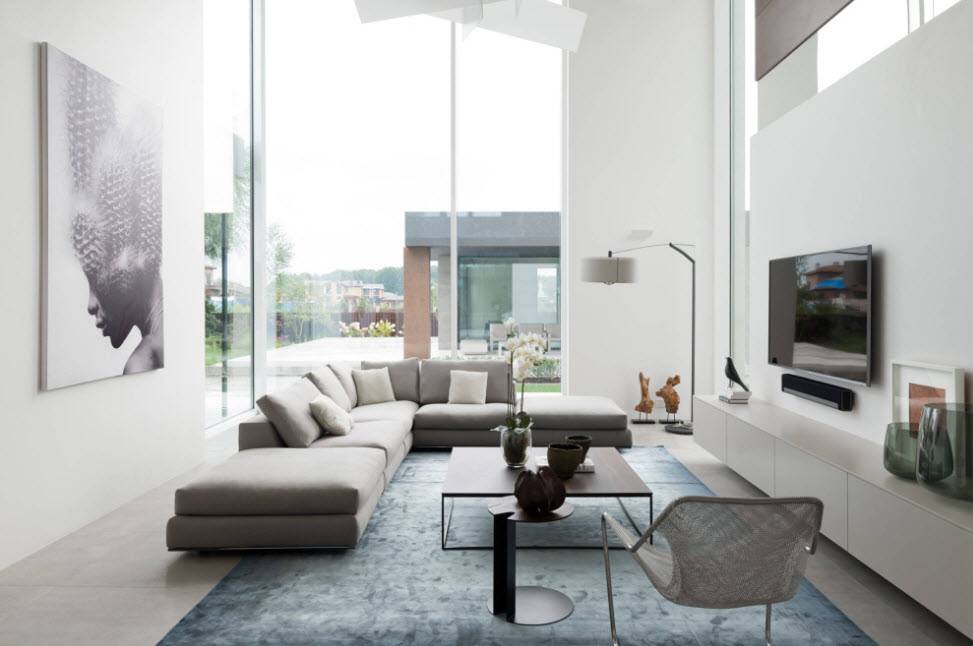 Цветовая гамма представлена идеально белым цветом или его производными: голубыми и серыми, бежевыми и молочными оттенками. Разбавить холодность интерьера помогут более насыщенные цвета, но их использование ограничено парой ярких акцентных пятен.