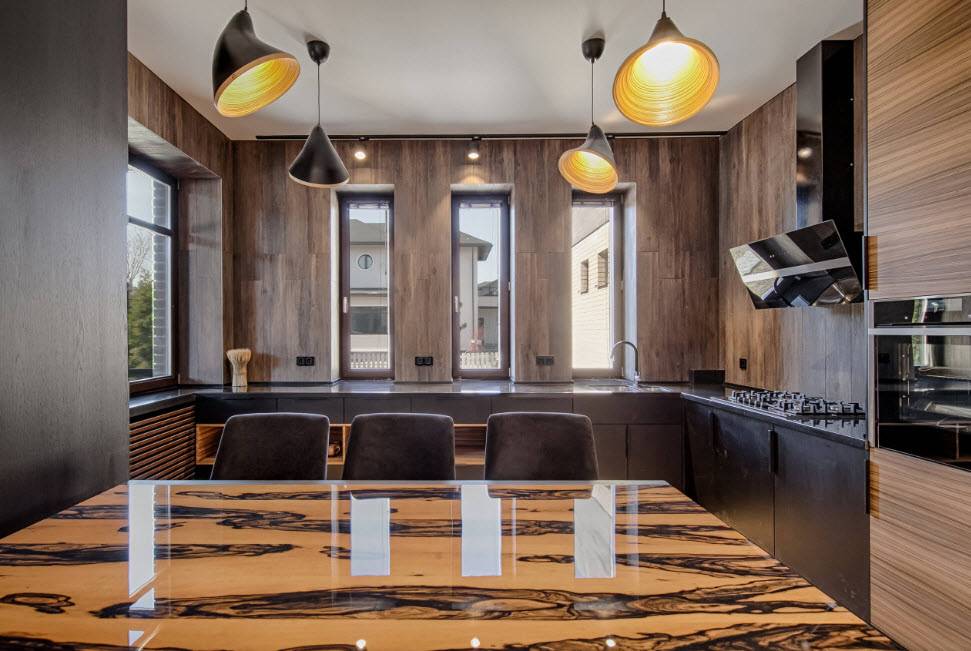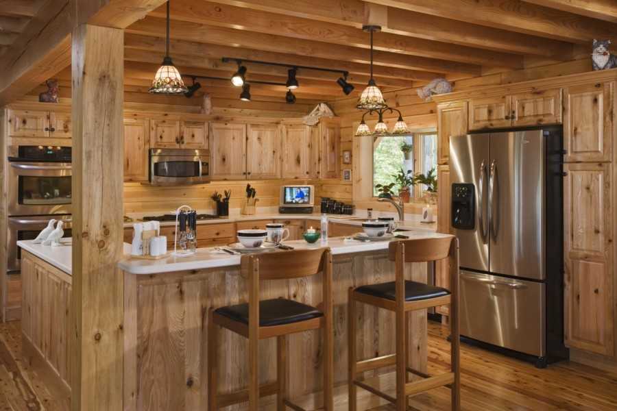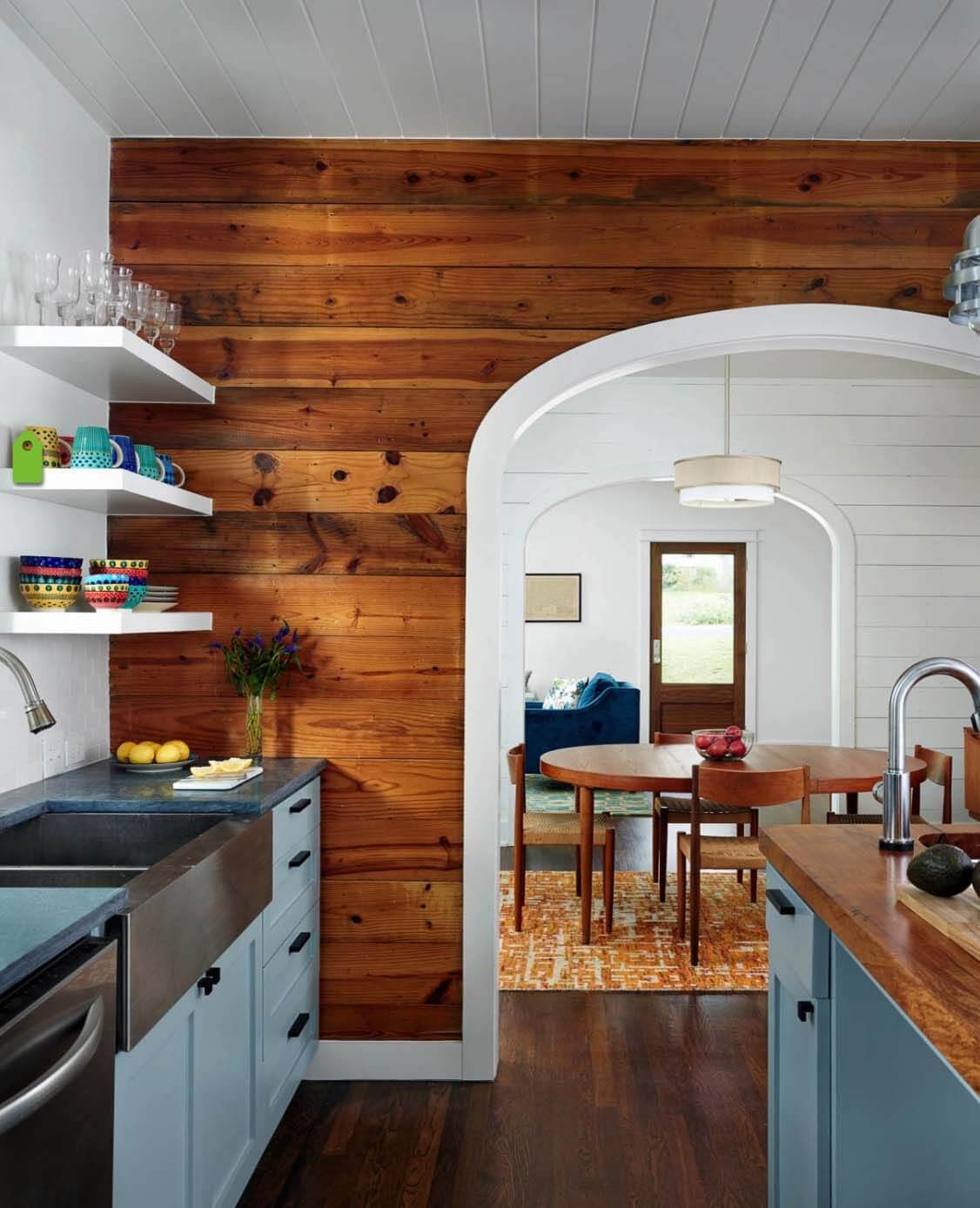Использование дерева на кухне является, прежде всего, практичным решением, так как жир и копоть для него не так страшны, как, к примеру, для обоев. Единственное, поверхность должна быть ровной и гладкой, чтобы ее легче было чистить. Поэтому от всевозможных резных панелей лучше отказаться в пользу обычной вагонки.
