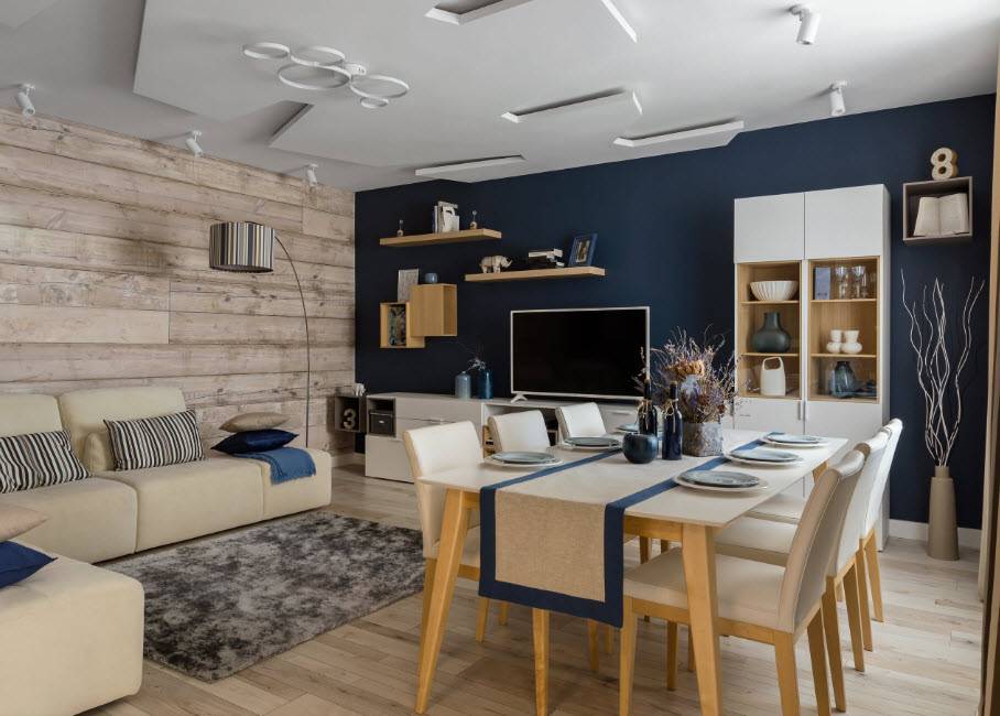 Предметами декора могут служить фигурки животных и птиц, картины морской и северной направленности. Строгость интерьера помогут разбавить камин, уютный ковер, насыщенное освещение.