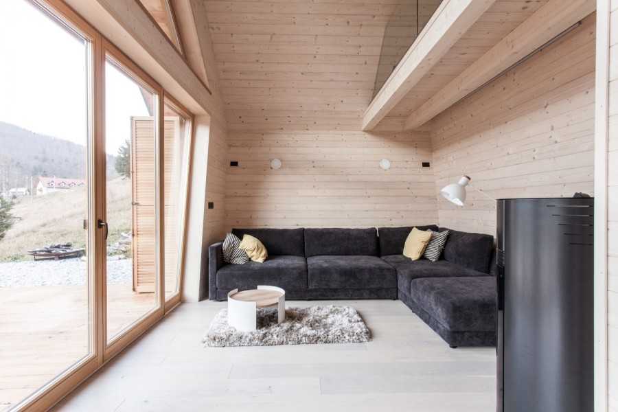 Стоит отметить, что создавая интерьер, где полы, стены и потолочные перекрытия выполнены из дерева, не нужно перегружать комнату громоздкой мебелью, ненужными элементами – можно ограничиться небольшим столиком, светлым ковром, мягкой мебелью с использованием натуральных материалов.