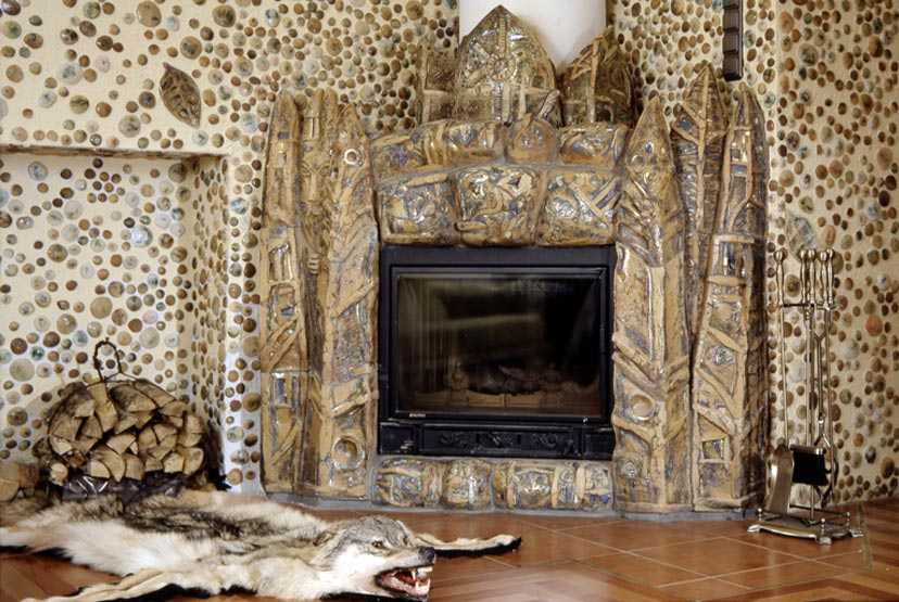 Для этого можно использовать различные материалы: фотообои, кафель, ПВХ панели, декоративный камень, др. Для придания изделию деревенской стилистики камин следует украшать деревянными элементами с резными узорами, покрытыми лаком или морилкой.
