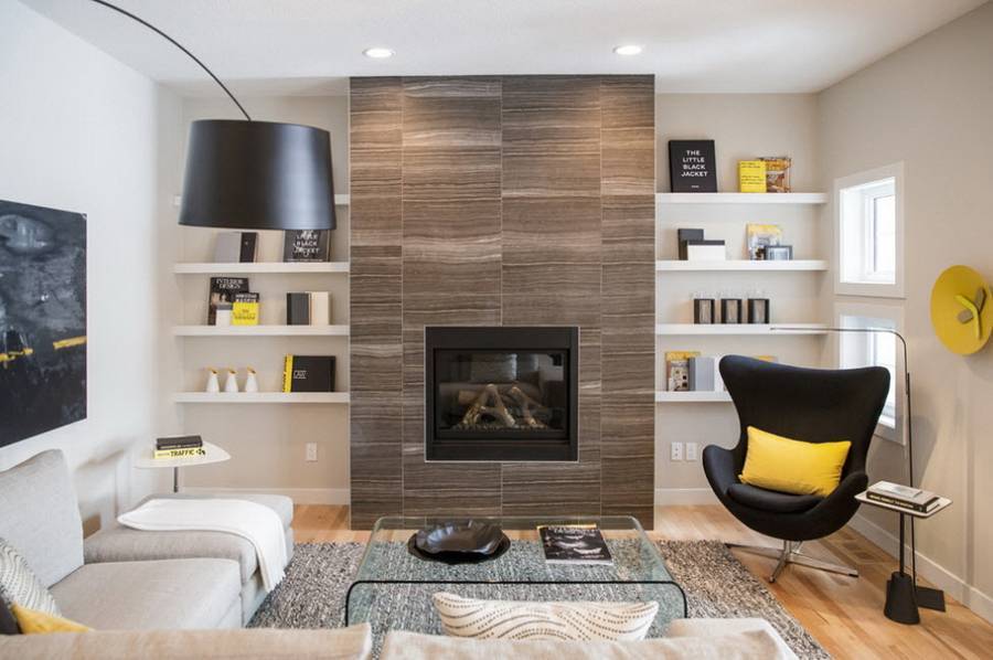 Камин, установленный в центральной части одной из стен гостиной, способен обеспечить симметричность всей планировки. Декоративный очаг станет своеобразной центральной точкой, вокруг которой размещают предметы мебели. Область над порталом украшают светильниками или книгами, картиной или панно с подсвечниками, монтируют телевизор или крупное зеркало.