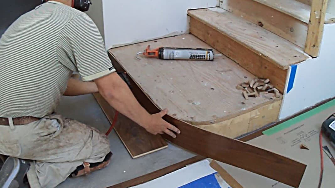 Подступенники могут устанавливаться через несколько дней после того, как клей схватится окончательно. Эту часть облицовки устанавливают с опорой поверх горизонтальной плоскости ступени. Между подступенником и свесом ламели должен оставаться зазор в 1-2 мм, его нельзя заклеивать или заполнять замазками.