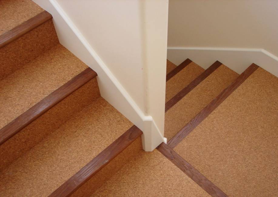 Пробку можно использовать как плитку или рулонное покрытие, которое предназначено для пола. Пробка хорошо изолирует от лишнего шума, поэтому, такая лестница точно скрипеть не будет. Пробку лучше использовать для пола в помещении, которое прилегает к лестнице, или для оформления лестничного марша.
