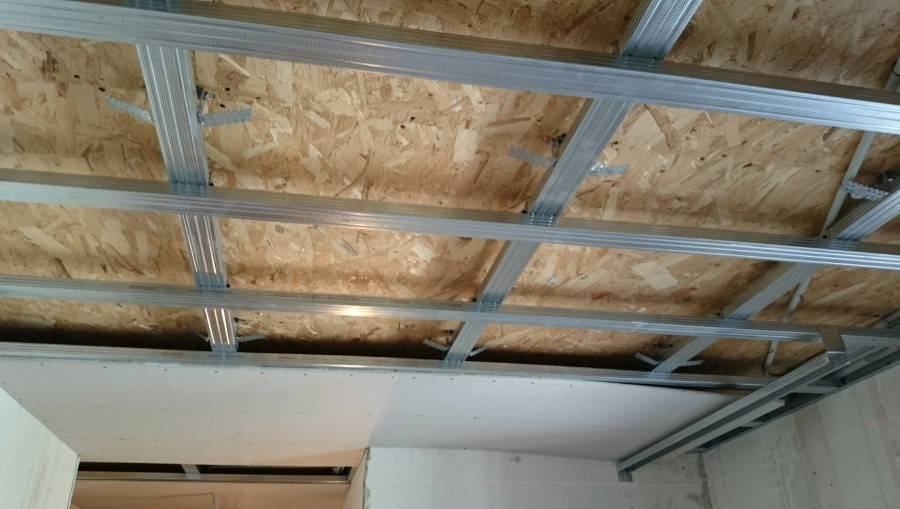 - Установка металлокаркаса. Раньше под строительство каркаса использовались деревянные рейки, сегодня же, чтобы построить каркас, нужен металлический профиль. Для установки каркаса используются потолочные и направляющие профили. Направляющие крепятся вдоль стены, а потолочные непосредственно к потолку.