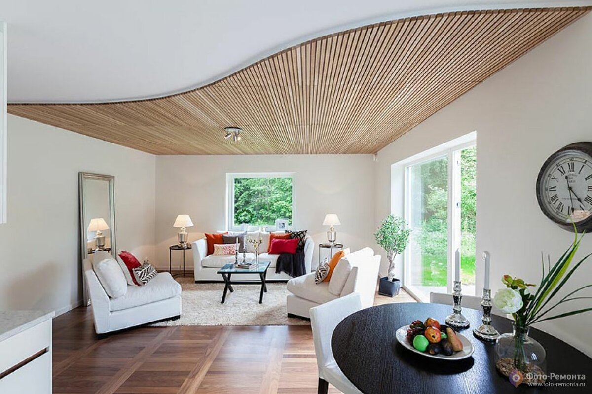 - Декоративное покрытие потолка нейтрализует весь смысл проживания в деревянном доме. Хотя это можно сказать практически обо всех современных отделочных материалах.