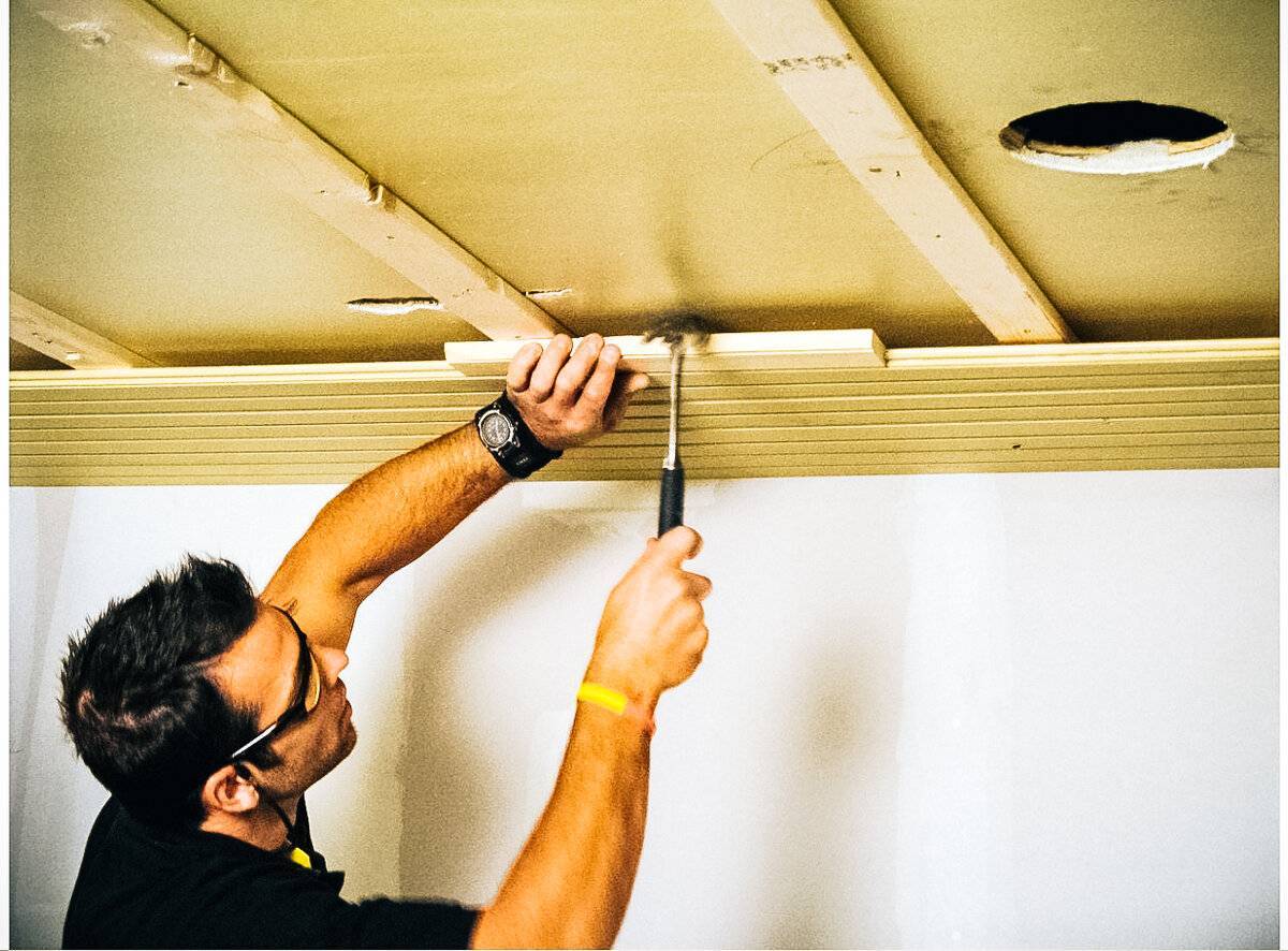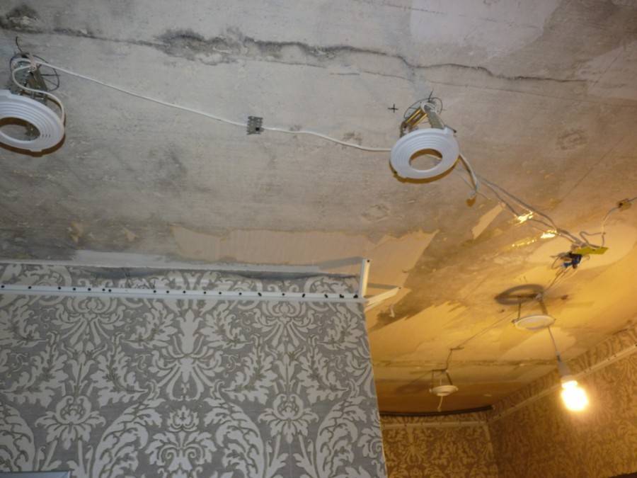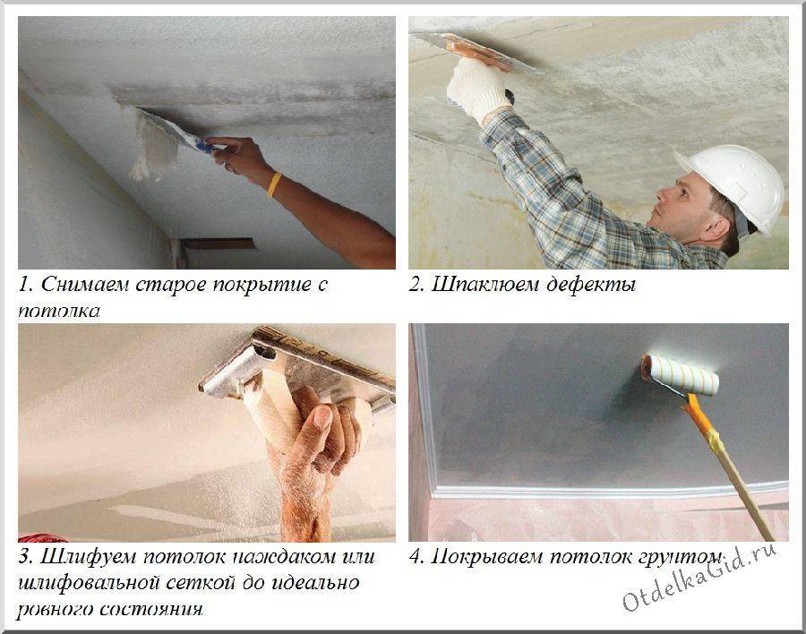 - Подготовка базового потолка. Потолок нужно проверить на прочность, если отделка не осыпается и не отпадает, то ремонт можно продолжать без особых переделок. Если же штукатурка сыпется, к примеру, то какие-то изъяны придется устранить.
