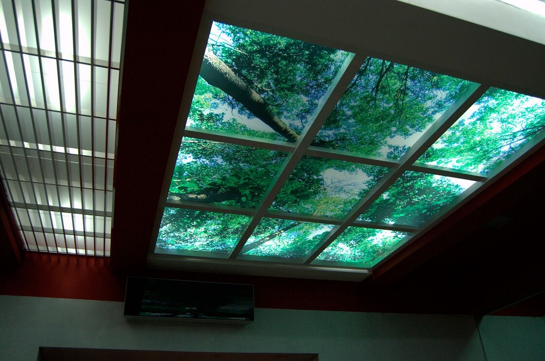 Фото обои – часто используемый вид материала при оформлении потолка.