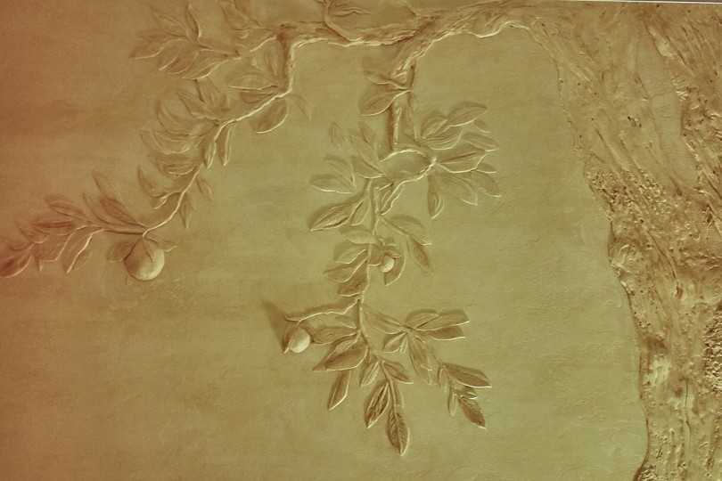 Потом стена покрывается слоем водоэмульсионной или акриловой краски, ее оставляют на три часа. Далее производится полировка металлическим шпателем, чтобы разгладить сильно выступающие пики. Часть краски тоже удаляется, обнажив базовый светлый слой. В результате получается яркий цветочный узор.