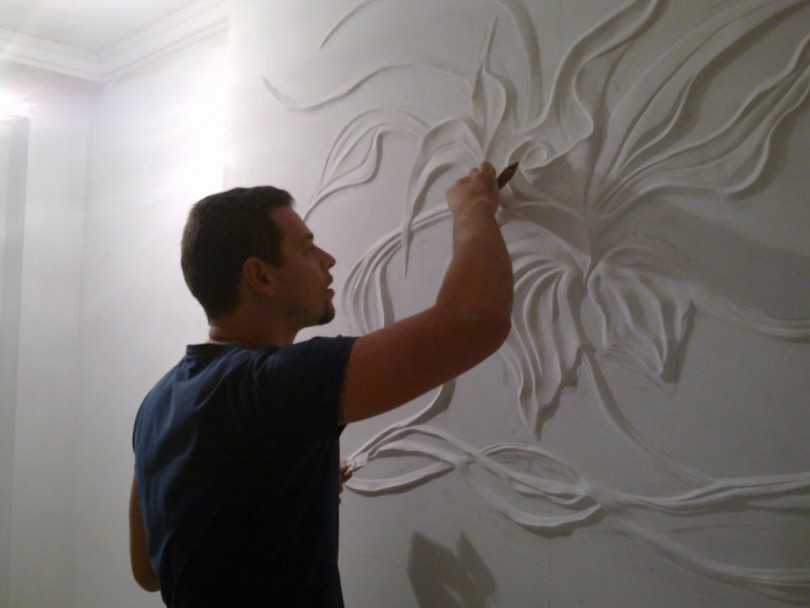 Можно выполнять волнистые узоры из линий собственными пальцами. Круглой пластиковой мочалкой можно оставлять кольцеобразные следы, губкой с крупными отверстиями сформировать поверхность, которая будет напоминать шагреневую кожу. Иногда рельефы наносятся обычным валиком, которым предварительно обматывают толстым шнуром — получается эффект бамбуковых стеблей.