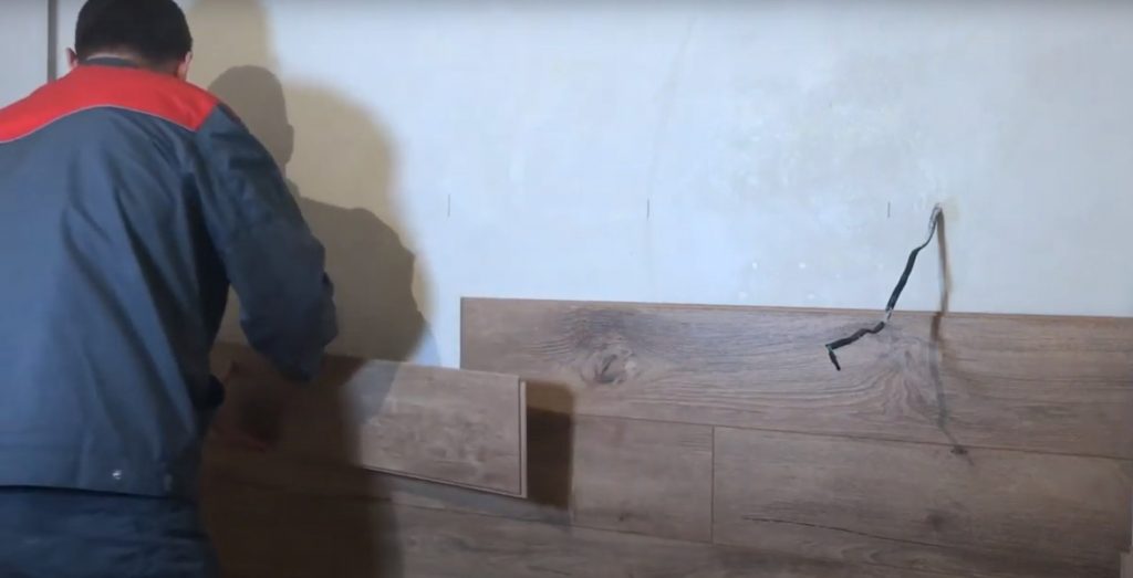 Начинать приклеивание материала следует с нижнего левого угла. Берут первую панель, разрезают пополам, смазывают клеем, затем прикладывают ее к стене, прижимают. Придерживать планку надо несколько секунд, после ее отрывают, чтобы клей немного обветрился. Потом доску снова прижимают для окончательного схватывания. Затем продолжают ряд вверх, оставив зазор между доской и полом в 2 см. Для этого нужно подложить прокладку из обрезков ламината. После эта щель закроется плинтусом. Для создания ровной поверхности используют уровень, по верху досок аккуратно простукивают молотком. Последняя доска в ряду также обрезается до нужной длины.