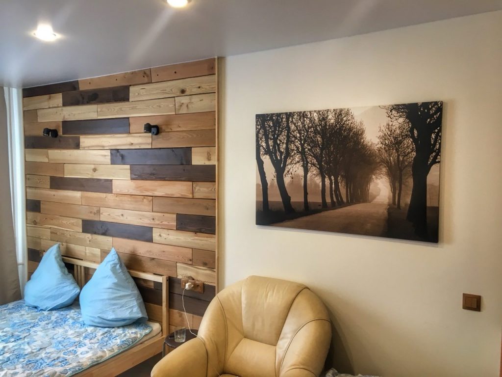 Благодаря ламинату на стенах, интерьер становиться очень тёплым и уютным