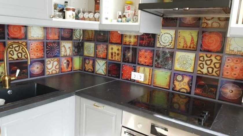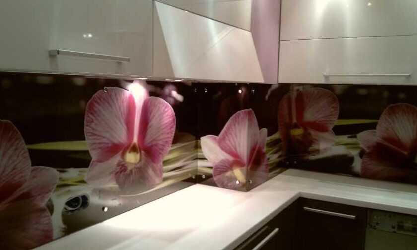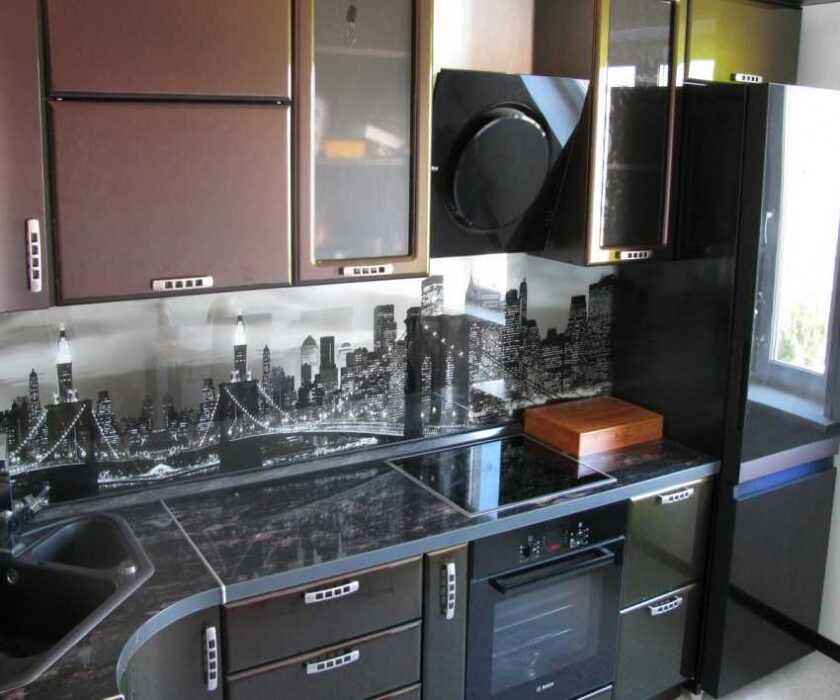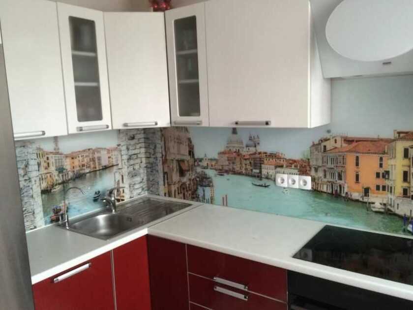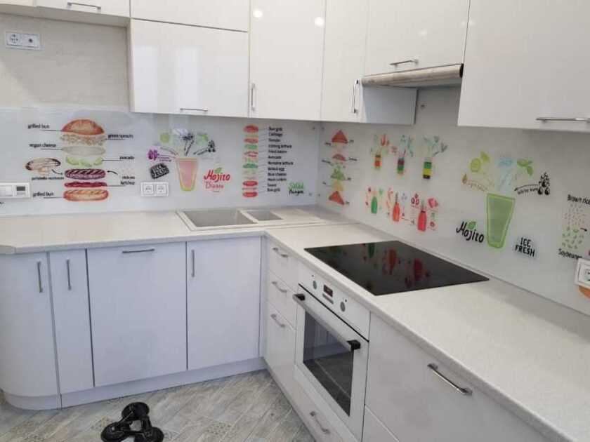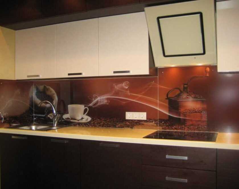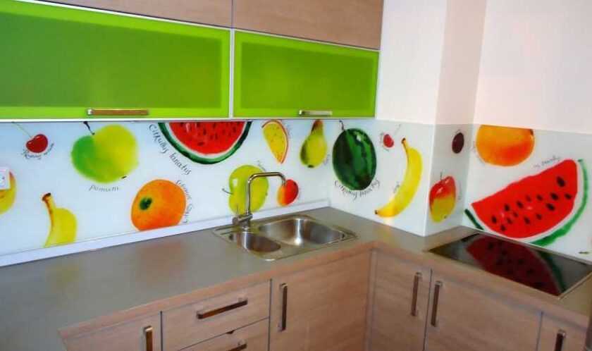 Если стеклянные плитки используются в процессе облицовки фартука, то на них может быть нанесена фотопечать. Хорошим вариантом будет стеклянная отделка стен на кухне для формирования цветового акцента. Кроме того, использование стеклянных поверхностей с небольшим глянцевым блеском способно визуально увеличить свободное пространство