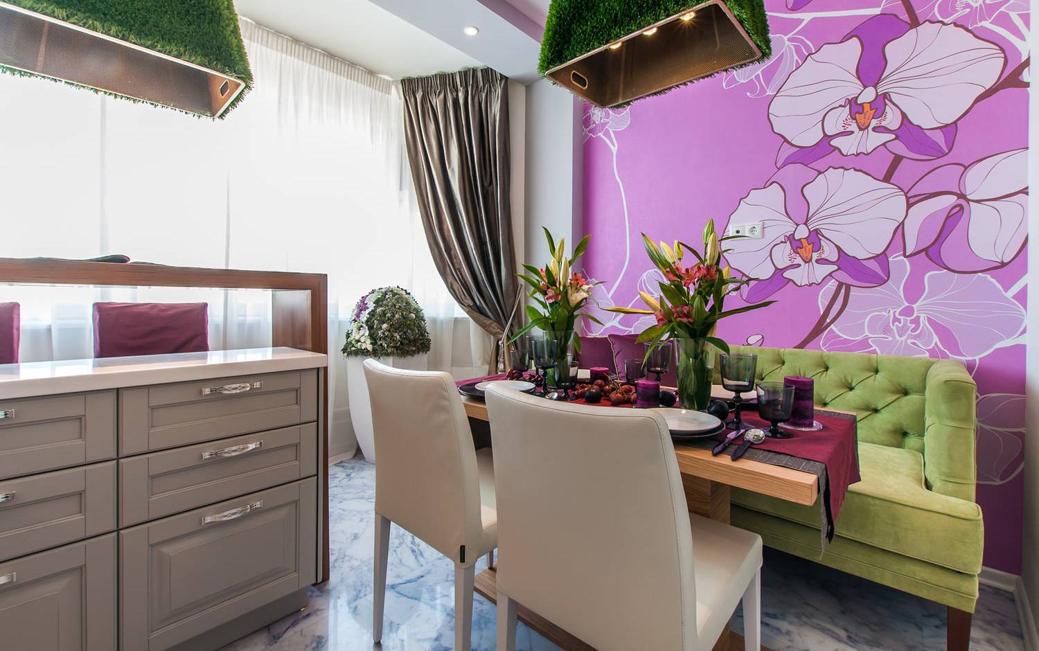 Обои на выступающих частях кухни. Нередко строители преподносят сюрпризы в плане планировки кухни. В углах оставляют ниши, посреди столовой выстраивают колонны, а иногда и сами хозяева выделяют территорию комнаты отдельными блоками в виде дополнительных стен. Так или иначе выступающие опоры и углубления необходимо учитывать в жилплощади и облагораживать их. Обои как раз сделают акцент на таких дополнениях;