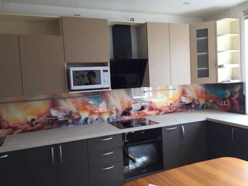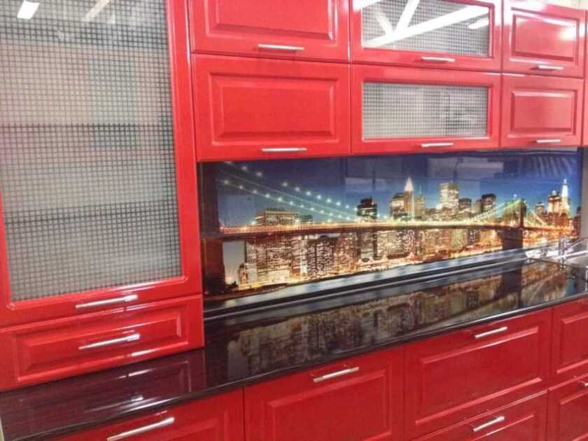 Что касается каленого стекла, то оно может подвергаться воздействию наиболее высоких температур, оно просто в уходе, и допускаются различные цветовые вариации. Если стеклянные плитки используются в процессе облицовки фартука, то на них может быть нанесена фотопечать. Хорошим вариантом будет стеклянная отделка стен на кухне для формирования цветового акцента. Кроме того, использование стеклянных поверхностей с небольшим глянцевым блеском способно визуально увеличить свободное пространство.