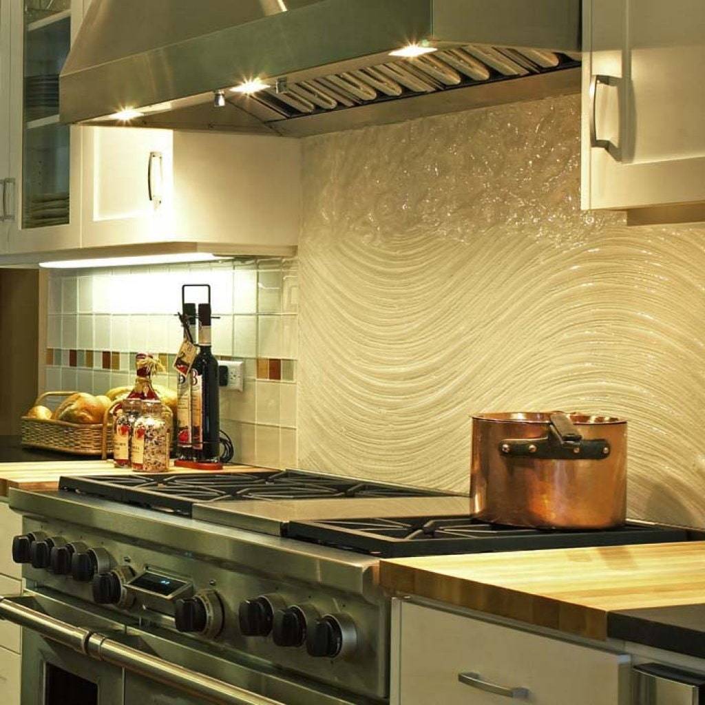 Учитывая то, что стекло и металл являются не только специфическими, но и довольно недешевыми материалами, для них характерно дозированное применение во время облицовки кухонной поверхности. Благодаря влагостойкости, стойкости к изменению температуры, к воздействию химических чистящих средств, попаданию жира и пара, плиты из стекла и нержавеющая сталь будут отличным вариантом для отделки стен в рабочей зоне кухни.