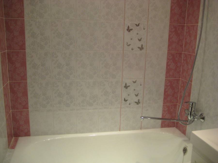 Здесь также потребуется установка временной направляющей и разметка от центра стены. Направляющая выставляется над ванной на высоте, равной длине одной плитки. Работаем так, как это было описано выше. После окончания отделки всех стен можно монтировать ванну.