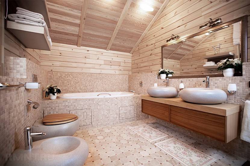 Мечта многих – ванная, отделанная деревом, обустроенная на мансардном этаже.