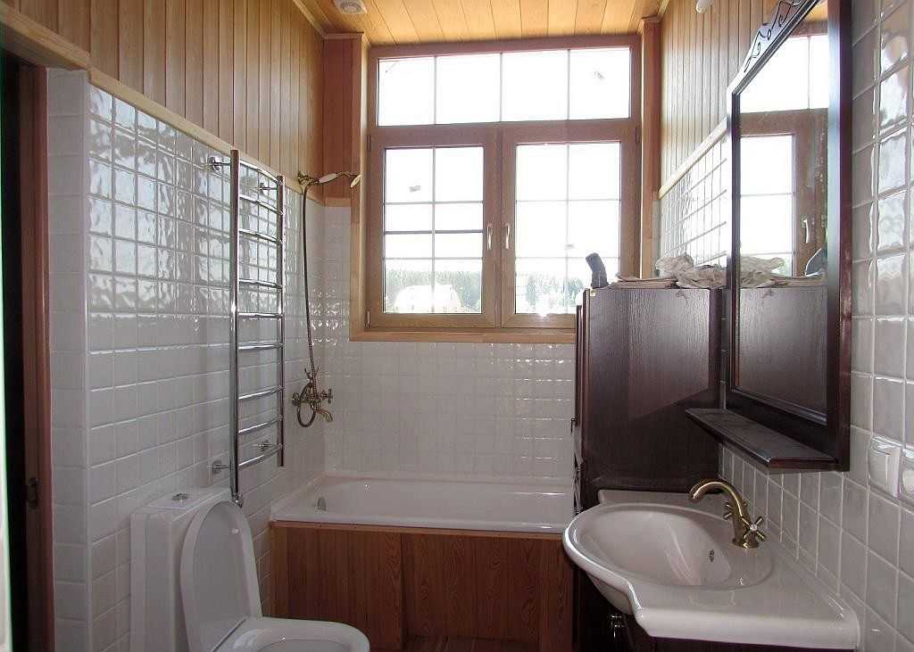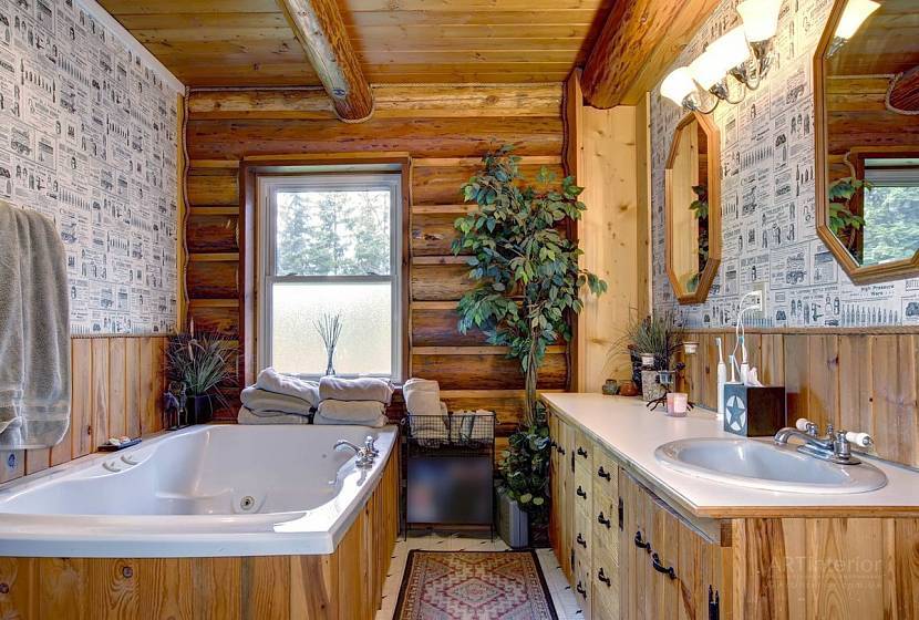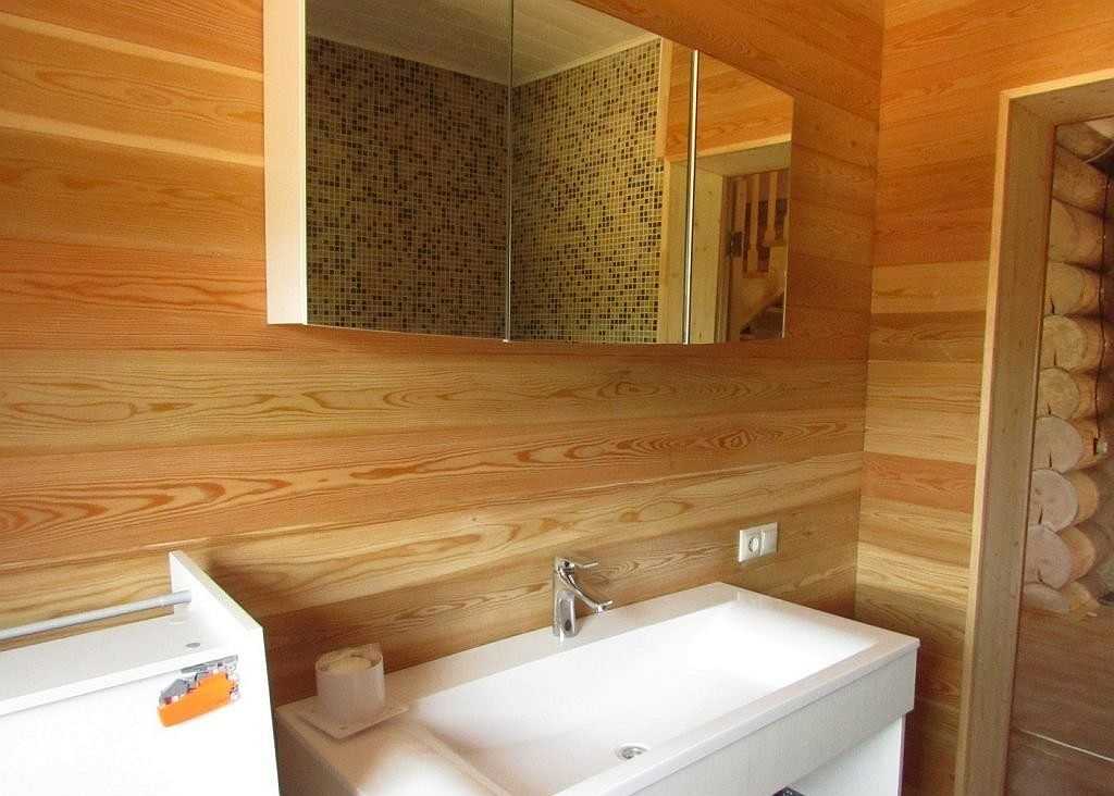 Вообще, использовать можно любые отделочные материалы пригодные для ванных комнат. Просто мало это практикуется — натуральная древесина стала слишком редким отделочным материалом, чтобы в деревянном доме использовать привычные обои или краски.