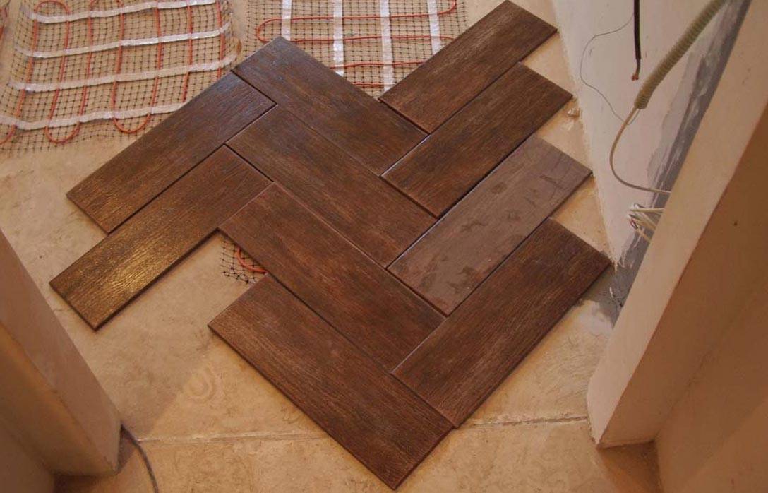 Техника монтажа плит «елочкой» выполняется прямо или по диагонали. Для диагонального расположения потребуется выполнить разметку пола. В укладке необходимы плиты 2-3 оттенков. Усложнить узор можно включением вставок контрастных оттенков либо орнамента. Рисунок позволяет создать акцент в ванной, стены комнаты должны быть однотонными, без сложного декора.