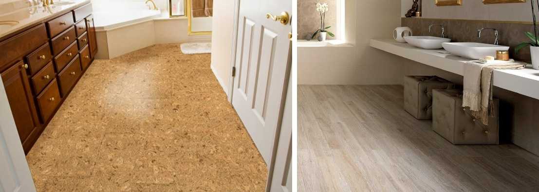 Про влагостойкие материалы для пола уже писали — это плитка ПВХ, линолеум, клеевая пробка. Все они нормально эксплуатируются в ванных. Еще один вариант — сделать дощатый пол и покрыть его лаком или маслом. Второй вариант не создает на поверхности жесткой пленки, а защищает не хуже.