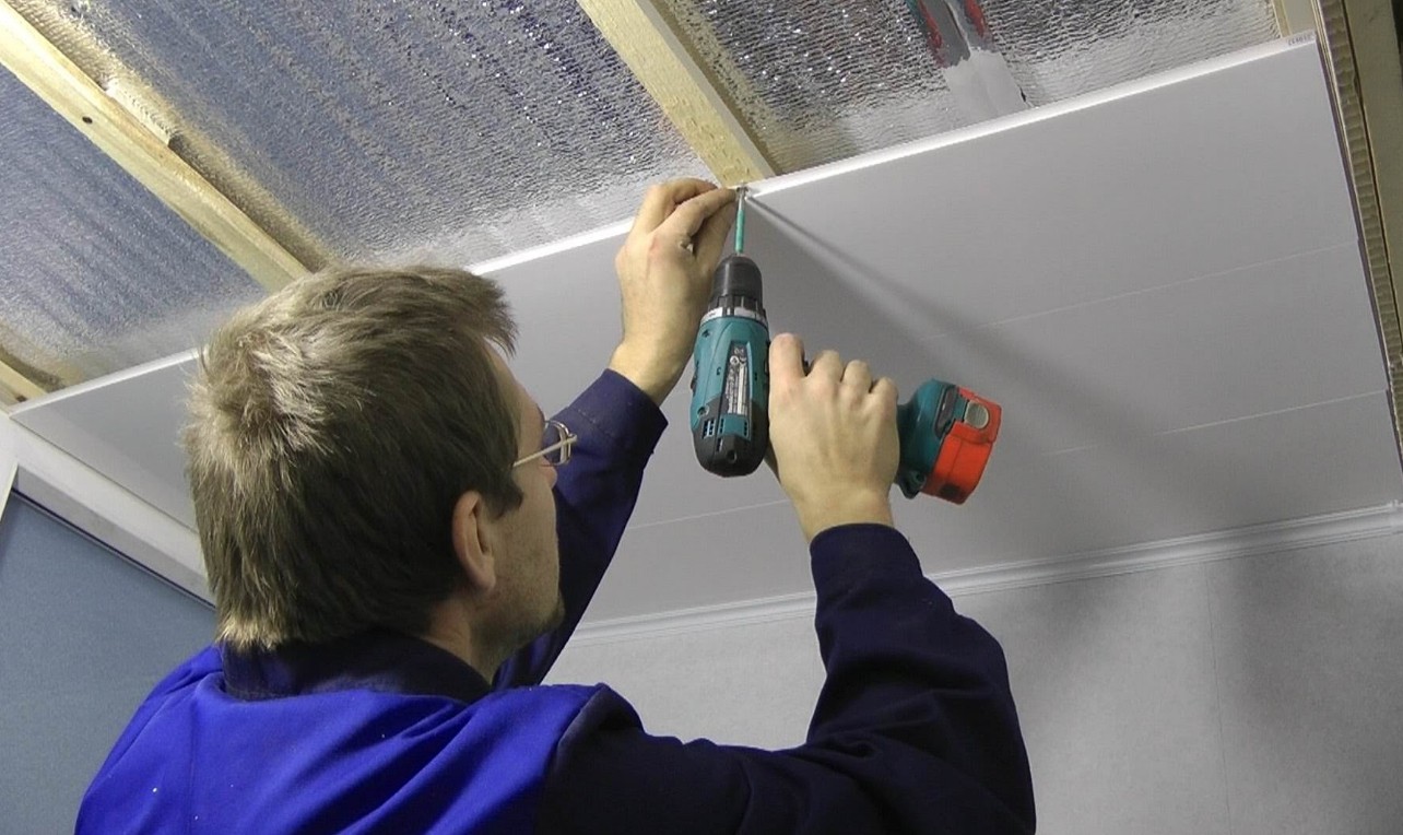 Далее устанавливается стартовый профиль или потолочный плинтус. Первая панель вставляется в профиль, следующие прикрепляется с помощью саморезов. Таким образом устанавливаются все элементы.