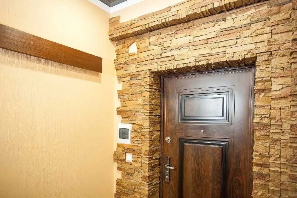 - Если стены в районе косяка двери имеют значительные, трудноустранимые дефекты, декоративный камень отлично их маскирует.