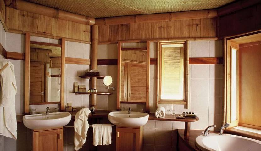 Завершающая отделка такого помещения должна начинаться лишь после того, как вы решите, что вы желаете видеть в итоге таких работ: экзотическую ванную в настоящем деревенском духе или интерьер, практически не отличающийся от городского. С современным оформлением особых вопросов не возникнет. Выбирай себе стиль, приобретай материалы и за дело, а вот попытаться сохранить первобытную атмосферу намного сложнее. Чтобы придать ванной очарование простоты, ее можно обставить деревянной мебелью и украсить специфическими, для деревенского быта, аксессуарами. Вот только подбирая такую мебель, учитывайте, что стандартно сделанные варианты не подойдут, поэтому ищите предметы защищенные обработкой от разрушения влагой. Если вы не нашли ничего подходящего самостоятельно, покройте мебельные поверхности эмалью, вскройте лаком или пройдитесь по ним грунтовкой.