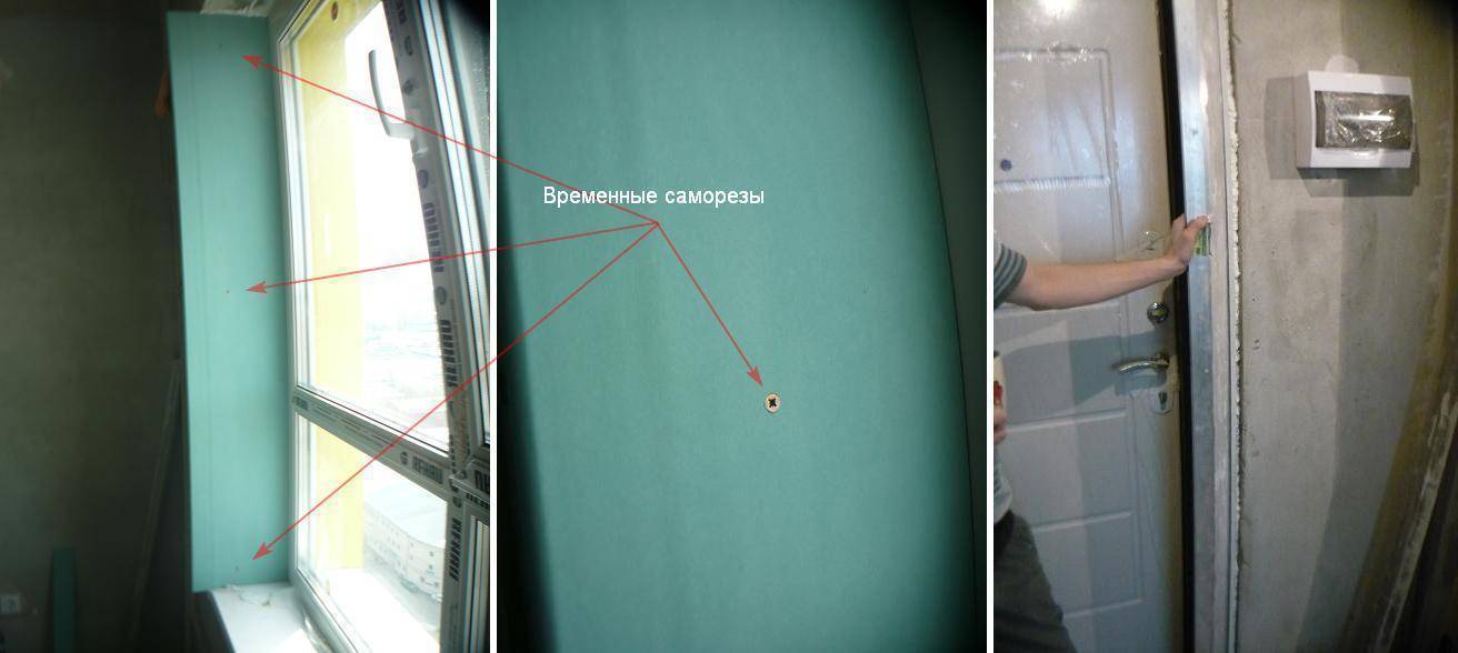 Мастера часто дополнительно закрепляют верхнюю часть откоса при помощи дюбелей или создают разнообразные подпорки, чтобы зафиксировать угол в подходящем положении, однако в этом нет острой необходимости. Откос легко сможет удержаться благодаря одной лишь силы поверхностного натяжения. Она не позволит гипсокартону переместиться в пространстве.