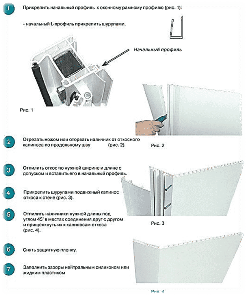 Вариант установки откосов со стартовым профилем, прикрученным к раме окна смотрите в этом видео.