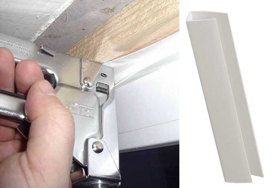 - Далее необходимо установить F-образный профиль. Монтаж данного профиля должен быть выполнен так, чтобы его паз был установлен напротив паза П-образной стартовой полосы. Паз F-образного профиля, находящийся выше окна, необходимо срезать. Верхняя часть данного профиля располагается внахлест. После точной стыковки лишние части F-полосок срезаются ножницами по металлу. F-профиль крепится к деревянным рейкам с помощью строительного степлера. Крепится та часть конца профиля, которая находится ближе к деревянной рейке. F-профиль, в первую очередь, играет роль декоративного элемента.