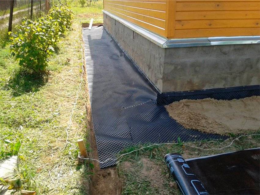 - Накрывается гидроизоляционная пленка, один ее край крепится к фундаменту, а другой – к грунту.