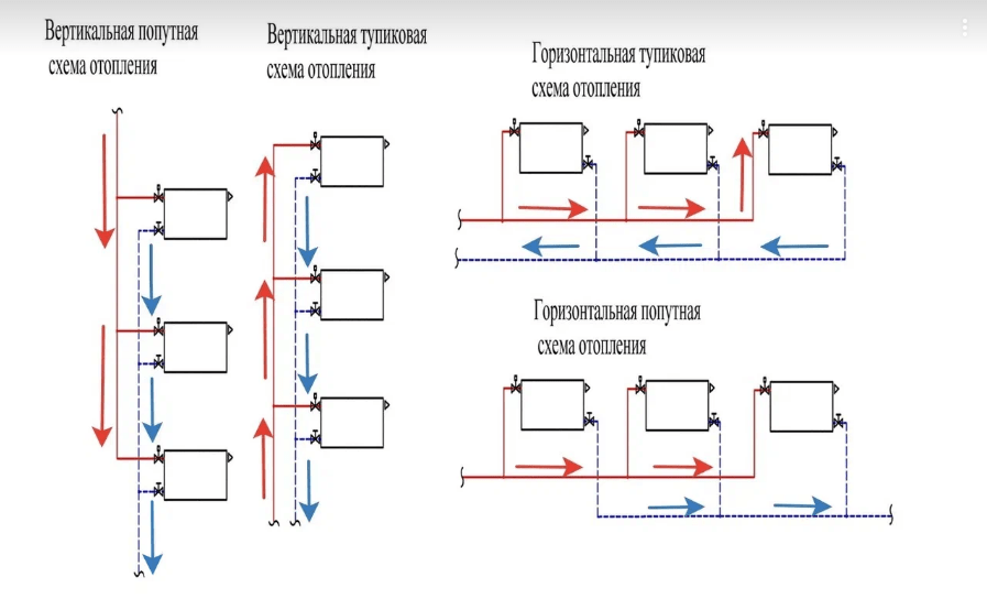 Двухтрубные схемы имеют несколько видов, различных по разводке.