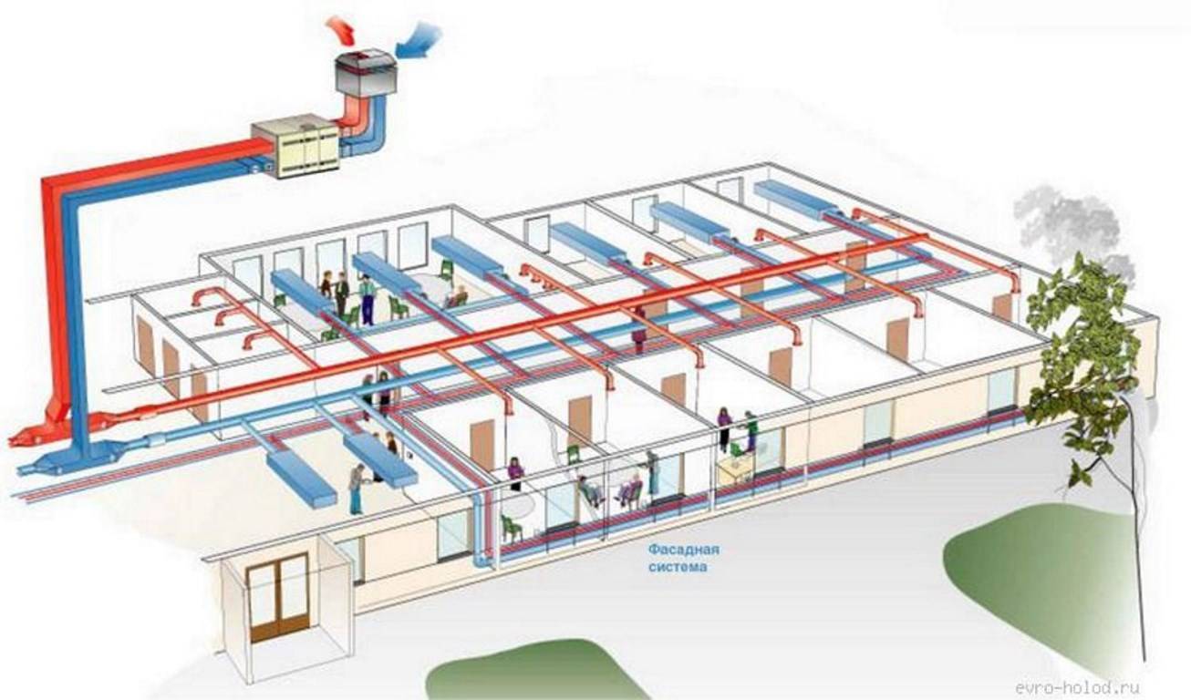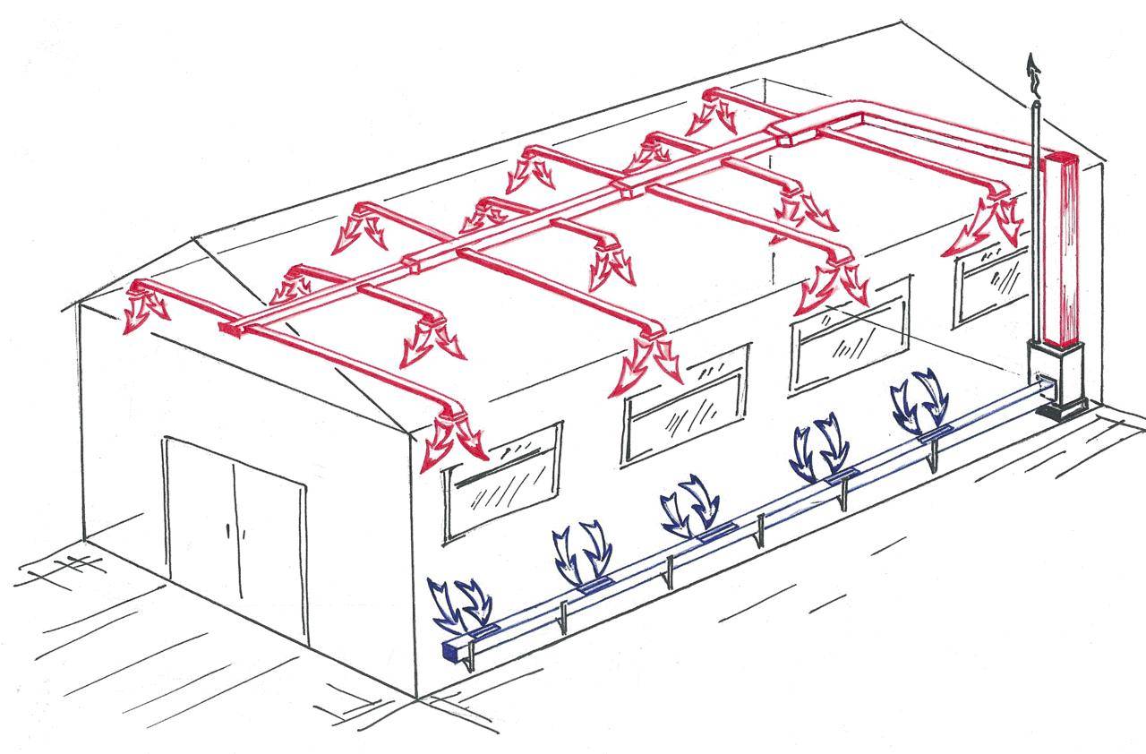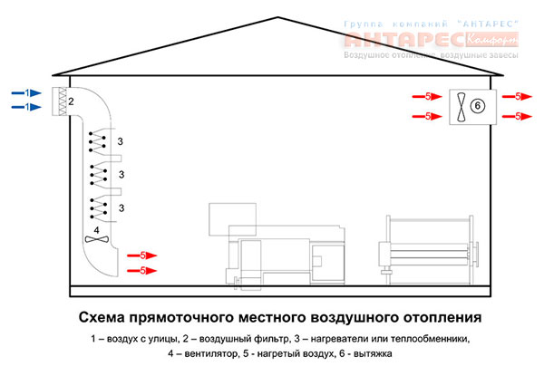 Внизу здания устанавливается теплогенератор, к нему делается разводка воздуховодов во все помещения здания, на которых устанавливаются вентиляционные решётки под потолком. Тёплый воздух из них выходит в комнаты.