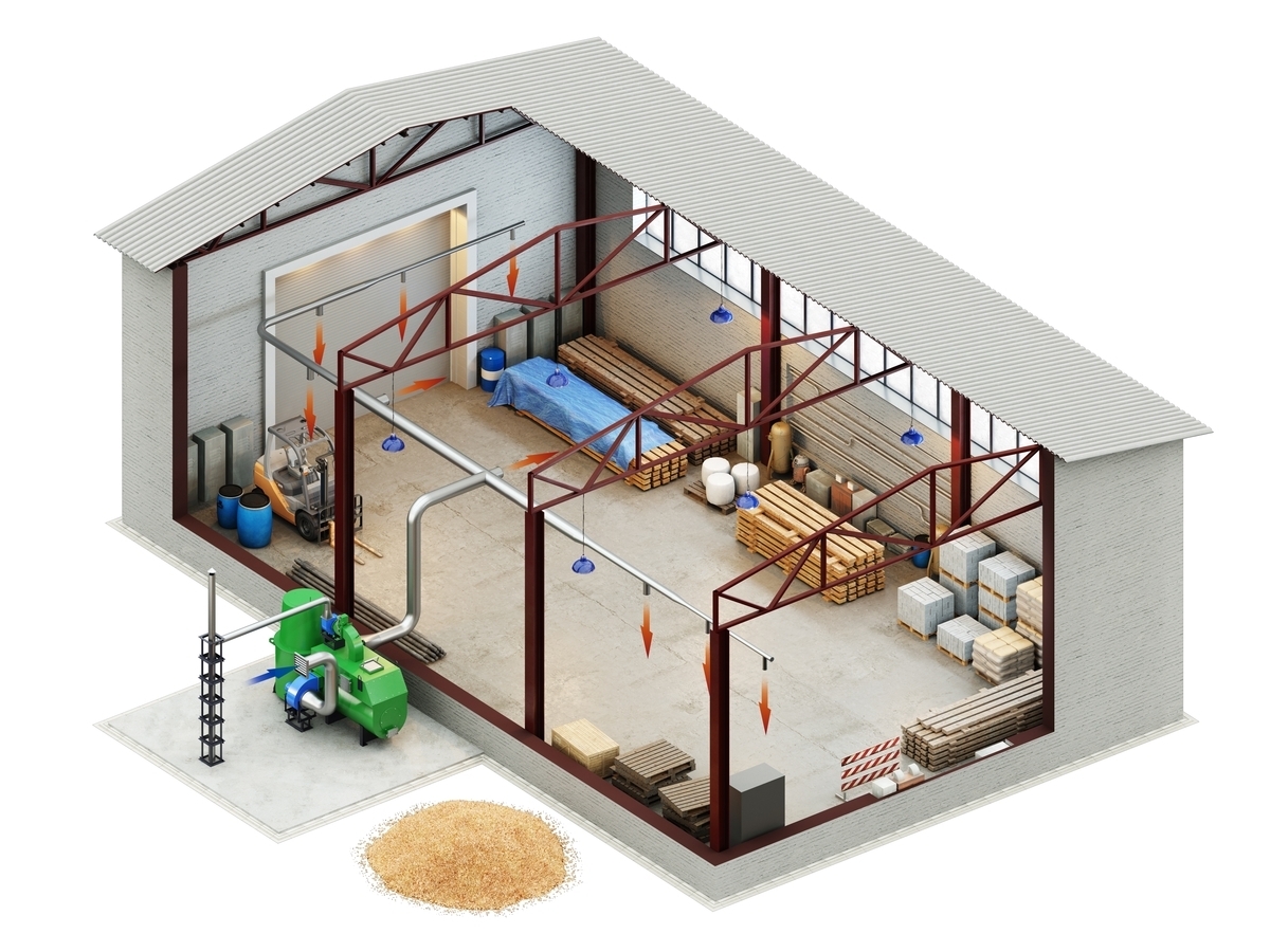 Использование воздушного отопления с применением приточной вентиляции особенно эффективно для помещений значительной площади – складов, цехов, торговых центров, выставочных павильонов.