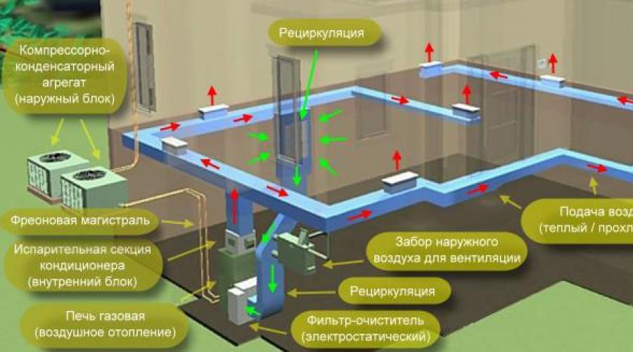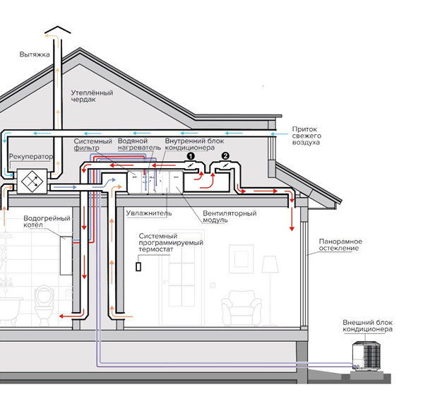 Намного сложнее система канального отопления. Здесь понадобится система с вентиляторами, увлажнители, фильтры, воздуховоды на приток и обратно, различные датчики. Но сложность системы оправдывается её эффективностью. А установив микродатчики в разных зонах, получится осуществлять индивидуальный контроль и поддерживать везде разный температурный режим. Такой способ позволит рационально использовать ресурс энергоносителя.