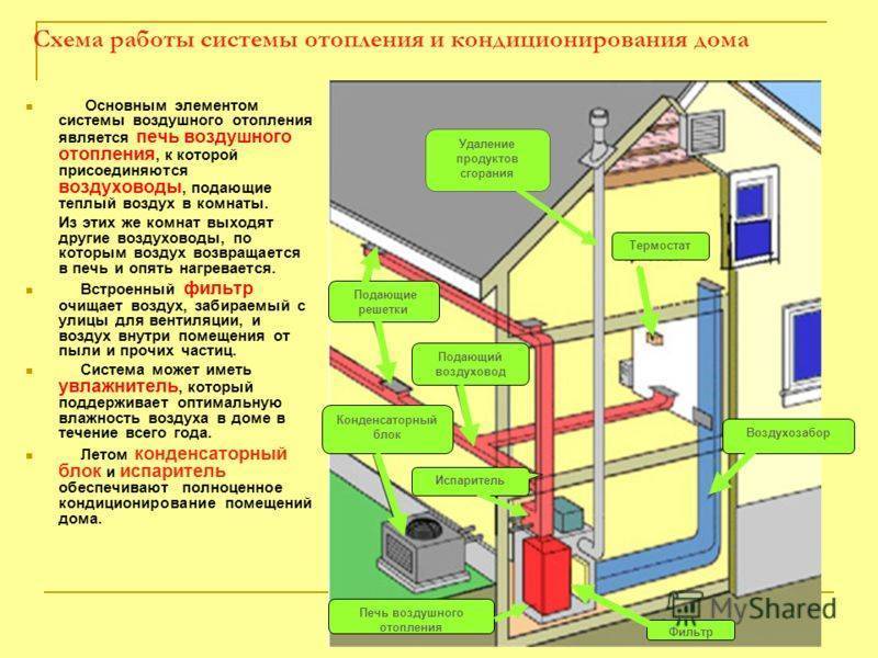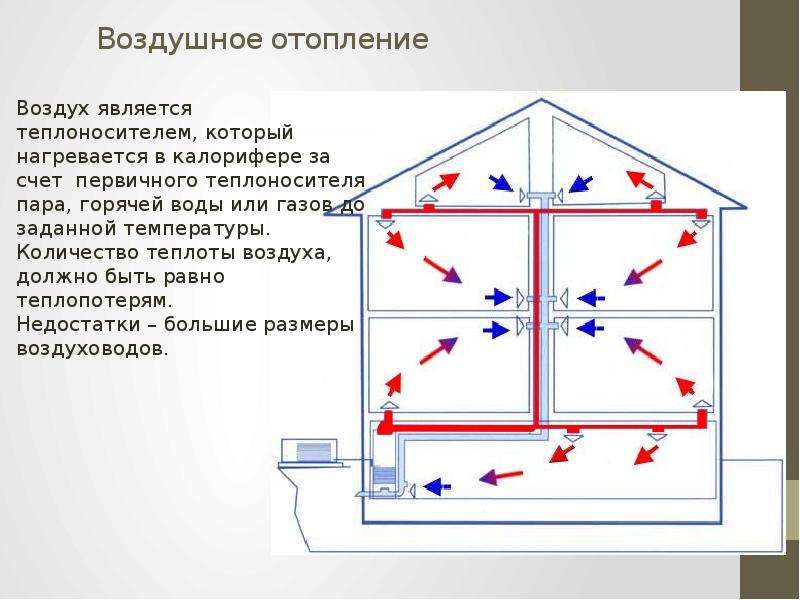 При видимой сложности, установить воздушную систему отопления под силу самому. Достаточно для этого воспользоваться специальными схемами. Но прежде чем принять решение, ознакомьтесь со всеми достоинства и недостатками. Очевидные плюсы: