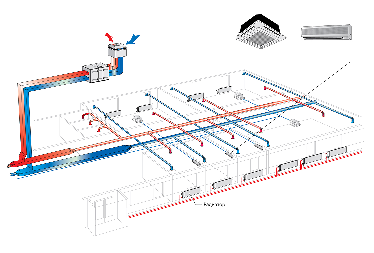 - Канальный кондиционер, который, в зависимости от погоды, способен нагревать, охлаждать и осушать воздух.