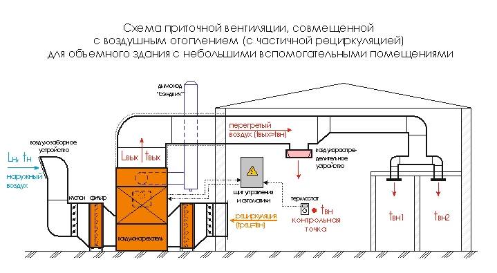 Эта схема предполагает не потерю нагретого воздуха, как в прямоточных системах, а его циркуляцию внутри здания, что значительно более экономично.