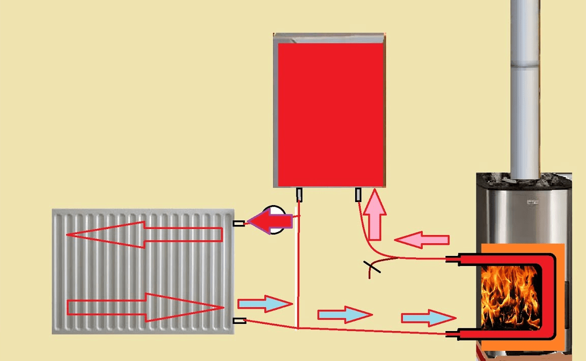 В обычных твердотопливных агрегатах, одной закладки хватает на 6-7 часов горения. Соответственно, если в топку не будет добавлена очередная порция ресурсов, температура в помещении сразу же начнет снижаться. Это происходит из-за того, что основное тепло по помещению циркулирует по принципу свободного движения газа. Нагреваясь от пламени, воздух поднимается вверх и выходит наружу.