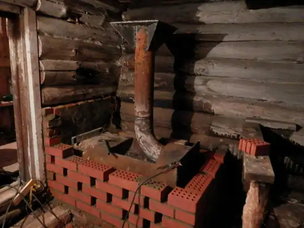 Фото 2. Печь горизонтальная с облицовкой из кирпича, расположенная в предбаннике, требующая достаточно большого места для установки.